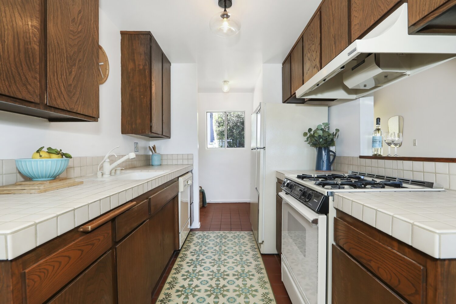 You can’t always judge a book by its cover! Inside this shy unassuming mid-century you’ll discover brightly sunlit open spaces with original soaring wood beam ceilings. As you pass thru the entry hall into the living spaces, distant mountain and canyon views are immediately unveiled as the backdrop. Rich wood detailing encompassing the Living and Dining areas reflecting the warm wood floors. Great galley kitchen with ample counter and cabinet space incorporating the quintessential pass through! This split-level floor plan offers 1 BR/1 BA upstairs and 2 BR/1 BA down. Both levels open out to charming verandas where you can enjoy cocktails while enjoying red tail hawks gliding at sunset or morning coffee with the waking birds echoing up from Bird Canyon. Easy maintenance lot offer a private and lush setting for the home. Don’t miss the basement! It’s a great opportunity to develop a music or art studio. These hills nurture the artist inside everyone, and a studio is sure to add value to your new home.